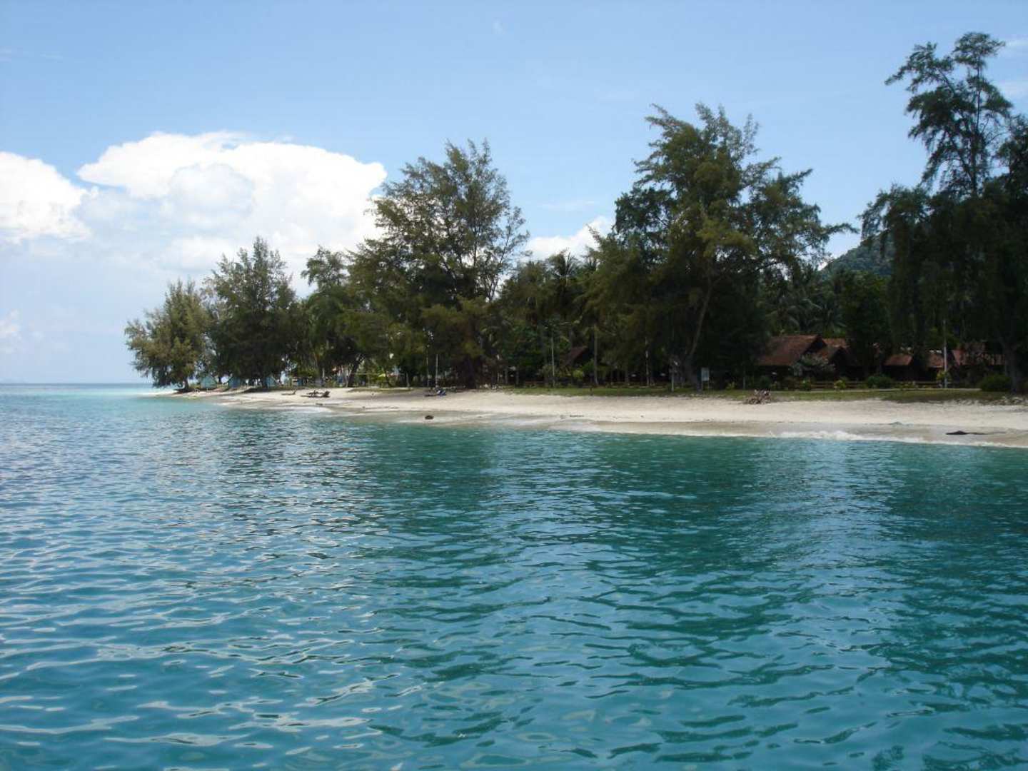 Blick vom Anlegesteg auf den Resortstrand