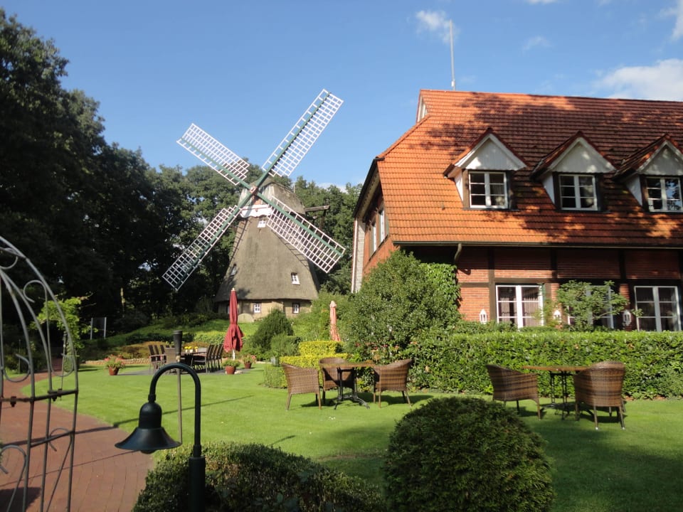 Blick auf Hotelrestaurant mit Mühle