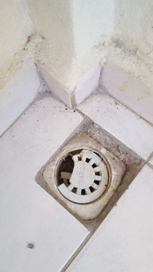 Schmuddeliger, gebrochener Wasserablauf im Zimmer.