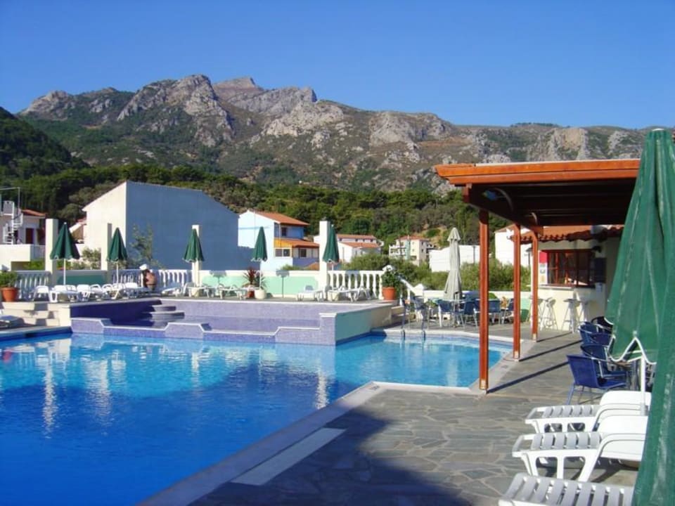 Der Pool des Athena in ruhiger Lage hinter dem Hotel, ist stets sauber gewesen, während unserer Zeit im Athena. Von hier aus geniesst man einen schönen Ausblick auf die Berge des Ambelos.