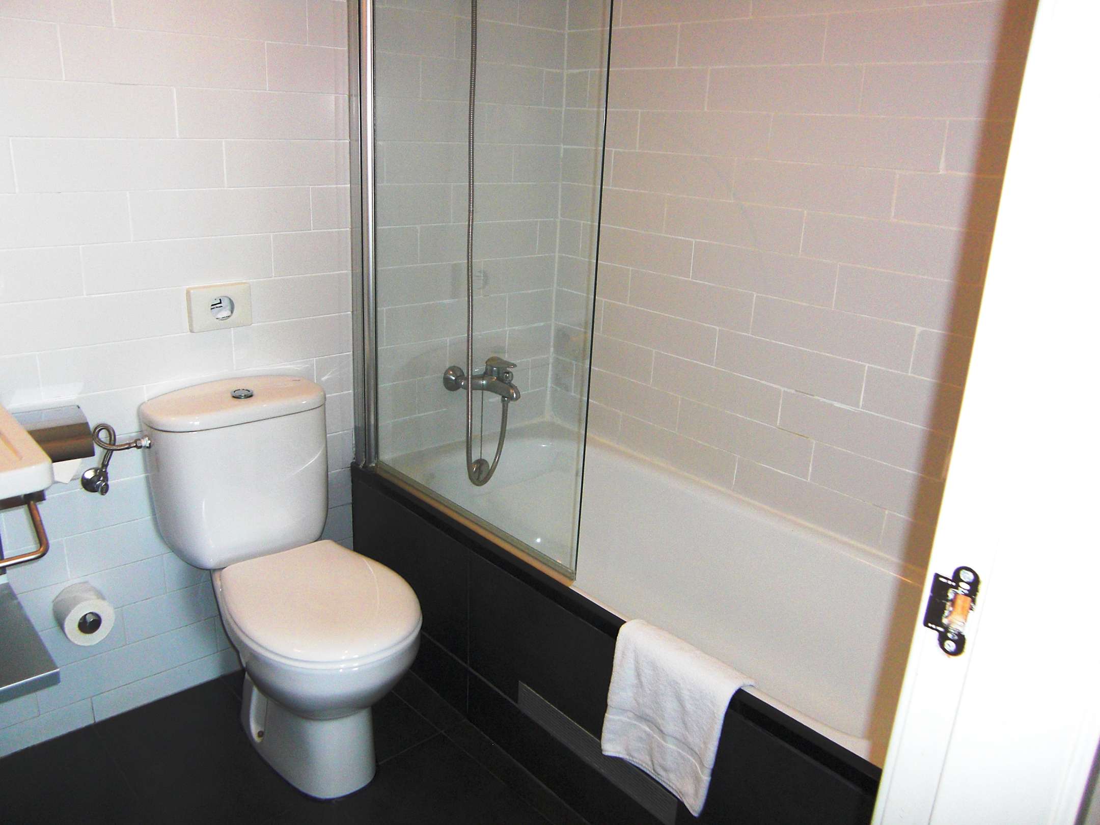 WC & Badewanne; Überschwemmung nach dem Duschen inbegriffen, da die Duschwand zu schmal ist.