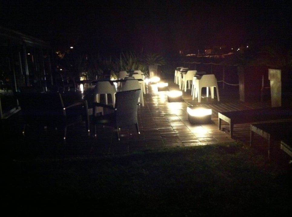 Die beleuchtete Terrasse vor dem Frühstücksraum