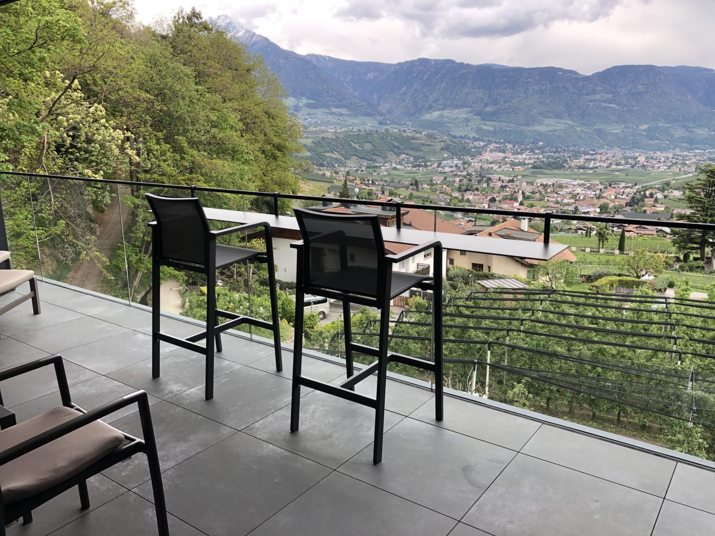 Grosse Terrasse mit Blick auf Meran, Stühle Tisch und Sonnenliegen