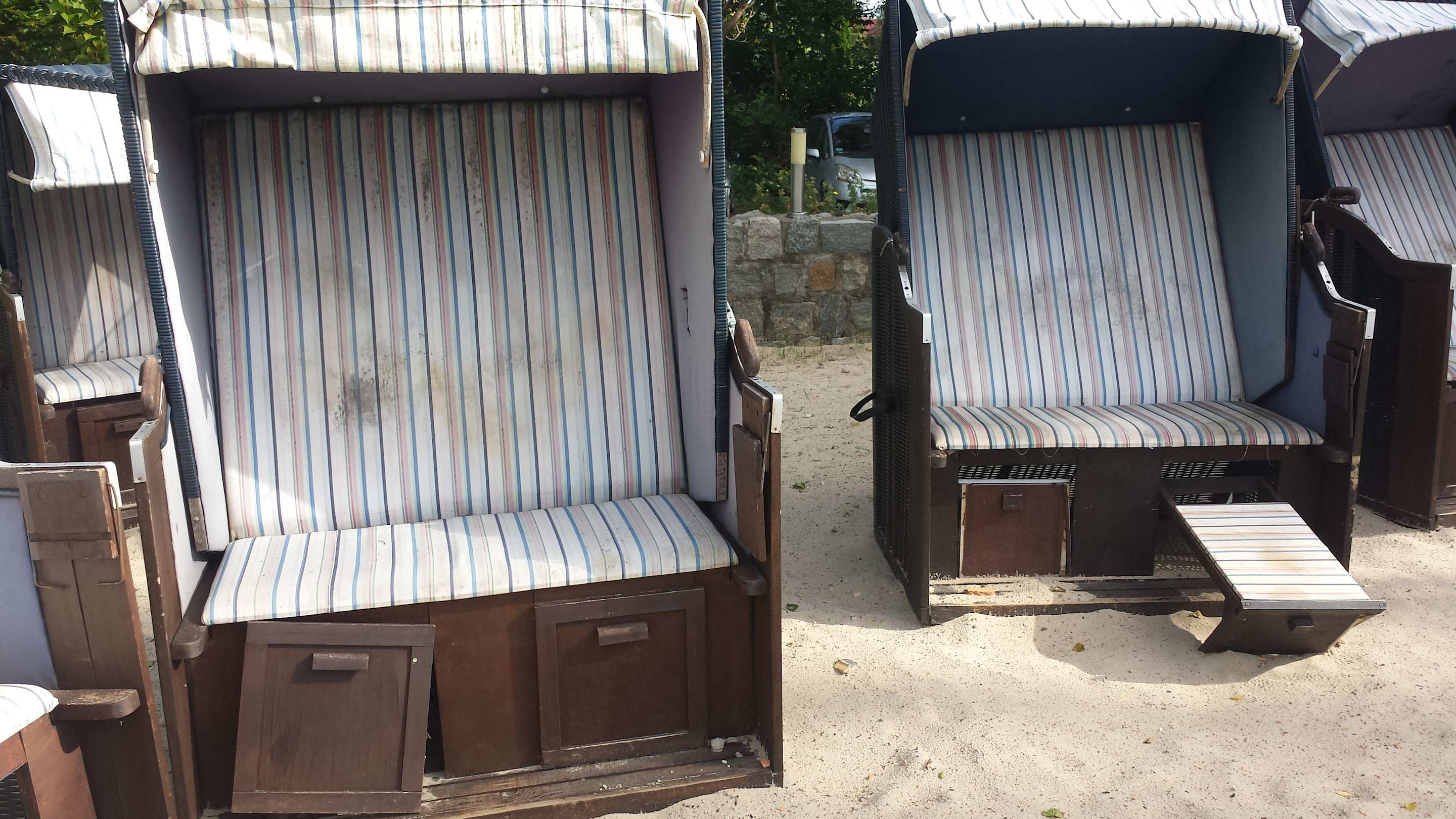 Wer möchte nicht mal in einem solch schicken Strandkorb liegen? Alle Strandkörber sind vergammelt, verdreckt, zerstört und sethen in schmutzigem Sand an einem wohl noch nie gereinigten Pool.