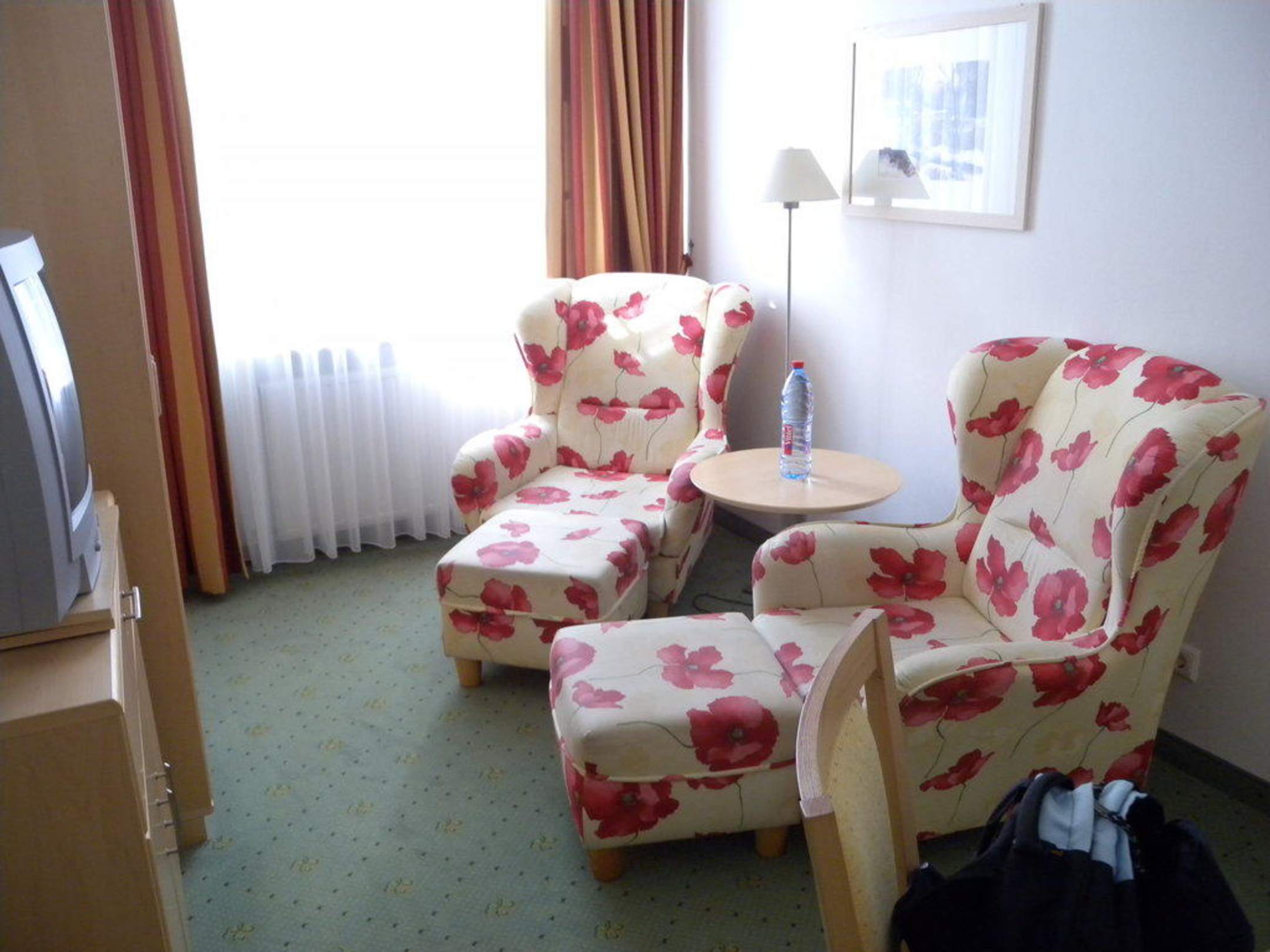 Zimmer 116 besteht aus 2 Räumen. Hier der 1. Raum mit zwei Ohrensesseln, Fernseher, Kleiderschrank und Schreibtisch. Rechts der Durchgang zum Schlafzimmer mit Doppelbett.