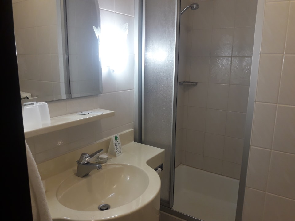 Sauber, aber in die Jahre gekommen, für Menschen mit körperlichen Einschränkungen ist die Dusche kaum zu benutzen, da ein ca. 20 cm hoher Rand zu übersteigen ist.