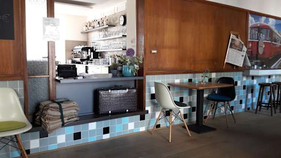 Vom vorderen Raum Sicht durch die Empfangstheke auf den Schankraum.