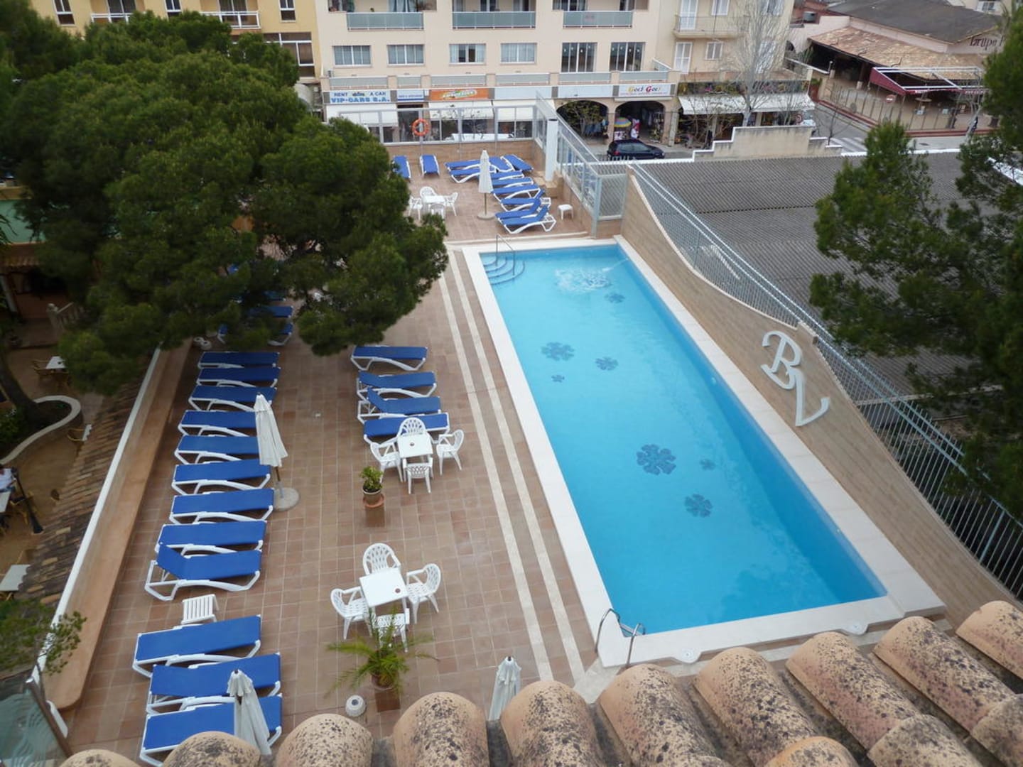 Die Poolanlage aus dem Zimmer fotografiert