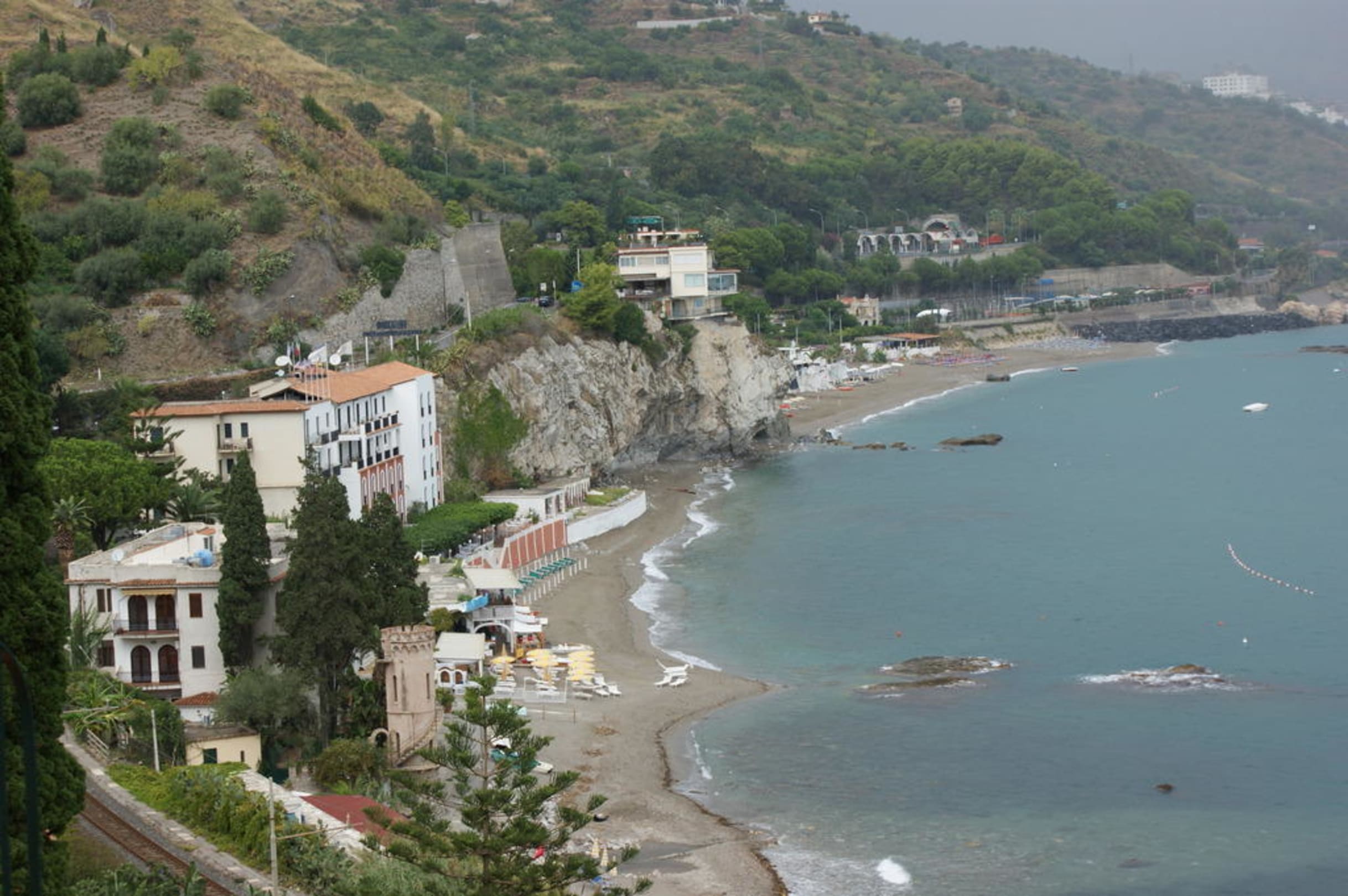 Widok plaży i zatoki z pokojuz lewej strony u dołu widoczne są tory kolejki, które przebiegają koło hotelu. Jeździ co godz., nam nie przeszkadzała.