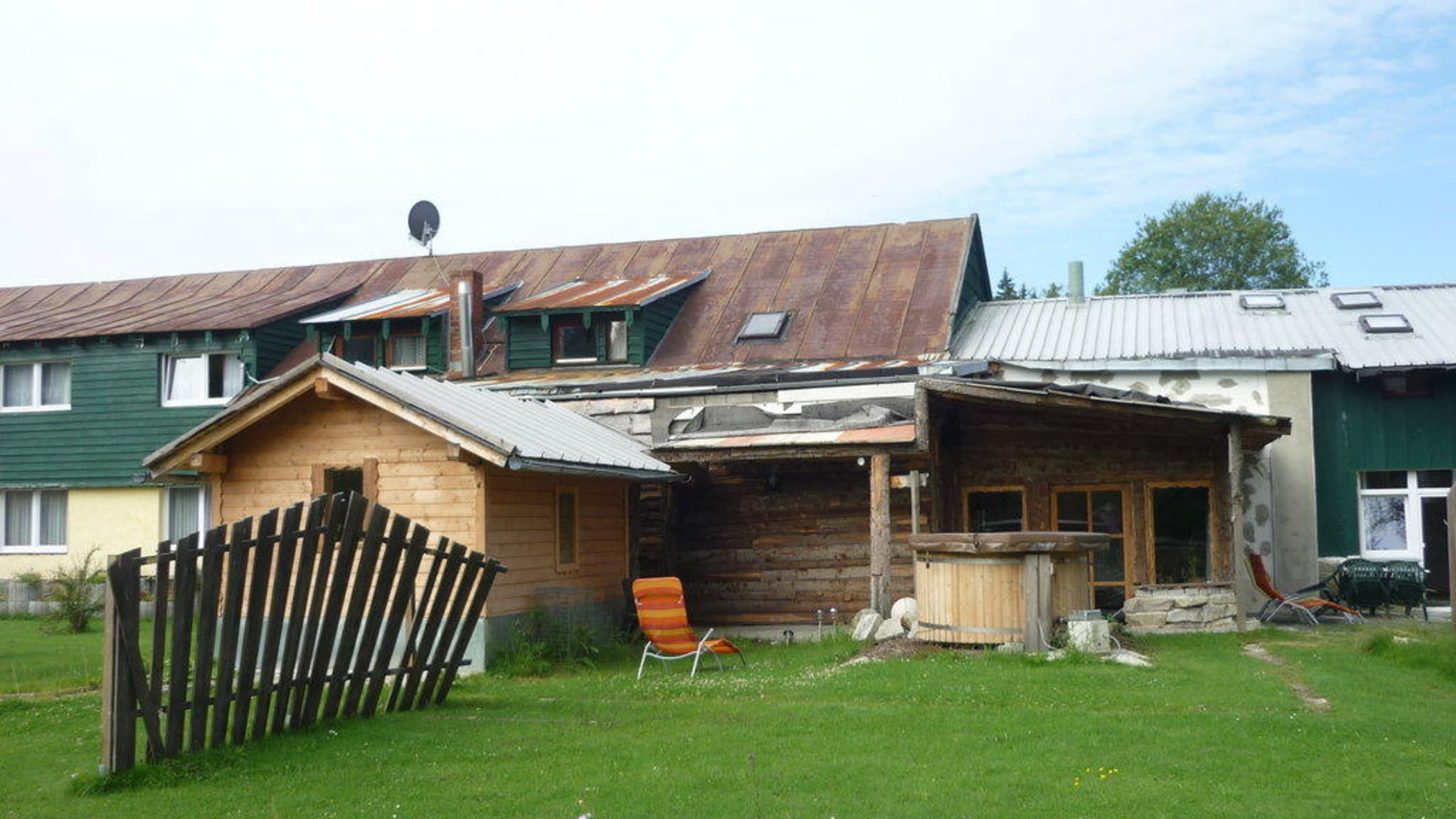 Rückansicht des GebäudesMan erkennt im Vordergrund das Außenbecken der Sauna. Die Überdachung links davon besteht aus Schaltafeln o.ä.