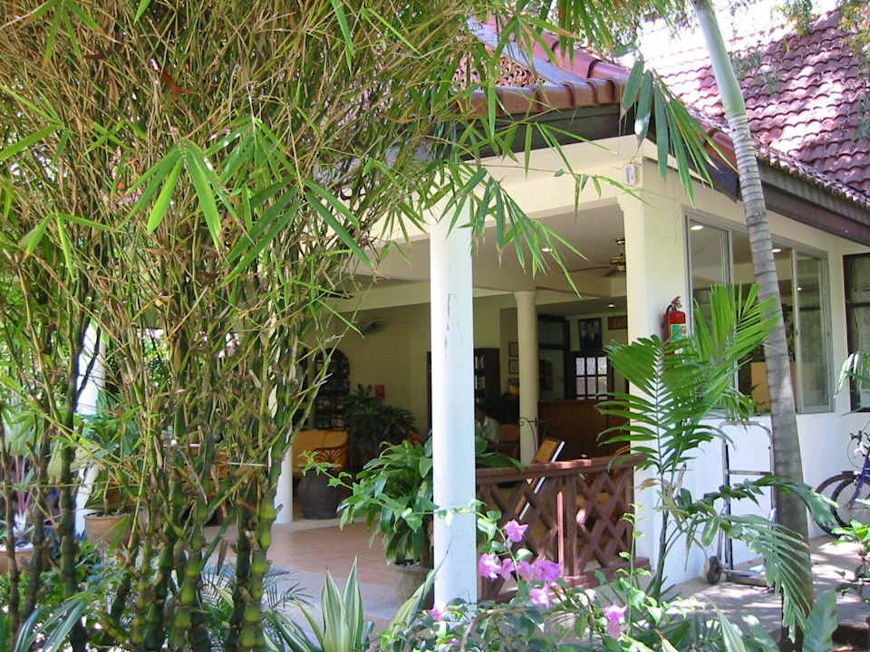 der Blick auf die Rezeption und die Lobby. Zum Empfang bekommt man ein kühles Handtuch und eine frische Kokosnuss während der Check-in vollzogen wird.