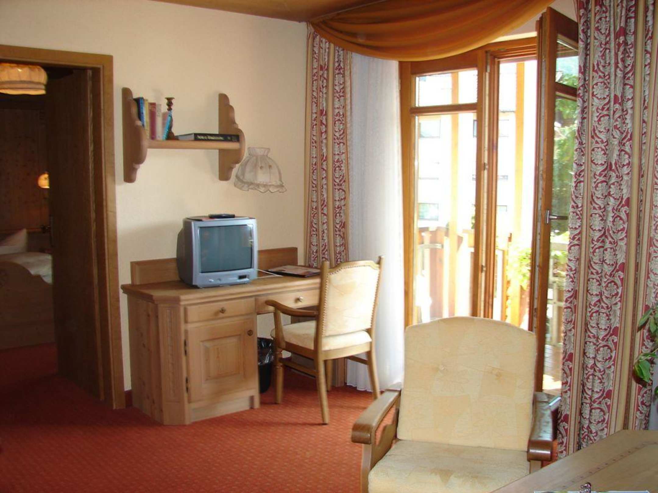 Hier sieht man den Schreibtisch mit Fernseher und Ausgang zum Balkon.