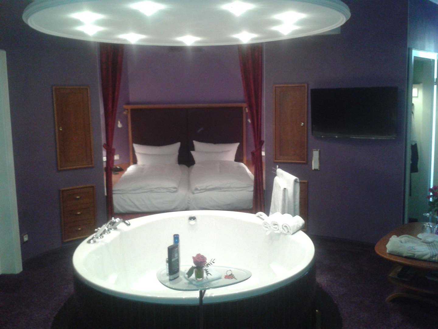 Doppelwanne mit Flat TV und Bett in der Nische im Hintergrund