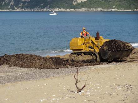 vor dem Saisonbeginn wird der Strand von angeschwemmten Seegras gereinigt