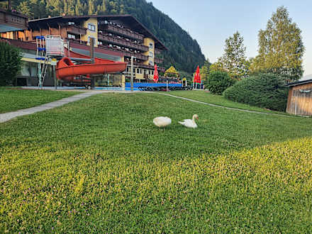 Pool mit Wasserrutsche und Besuch von Schwänen