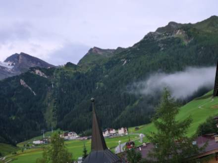 Blick vom Balkon zur Gletscher Talstation und gefrorenen Wand