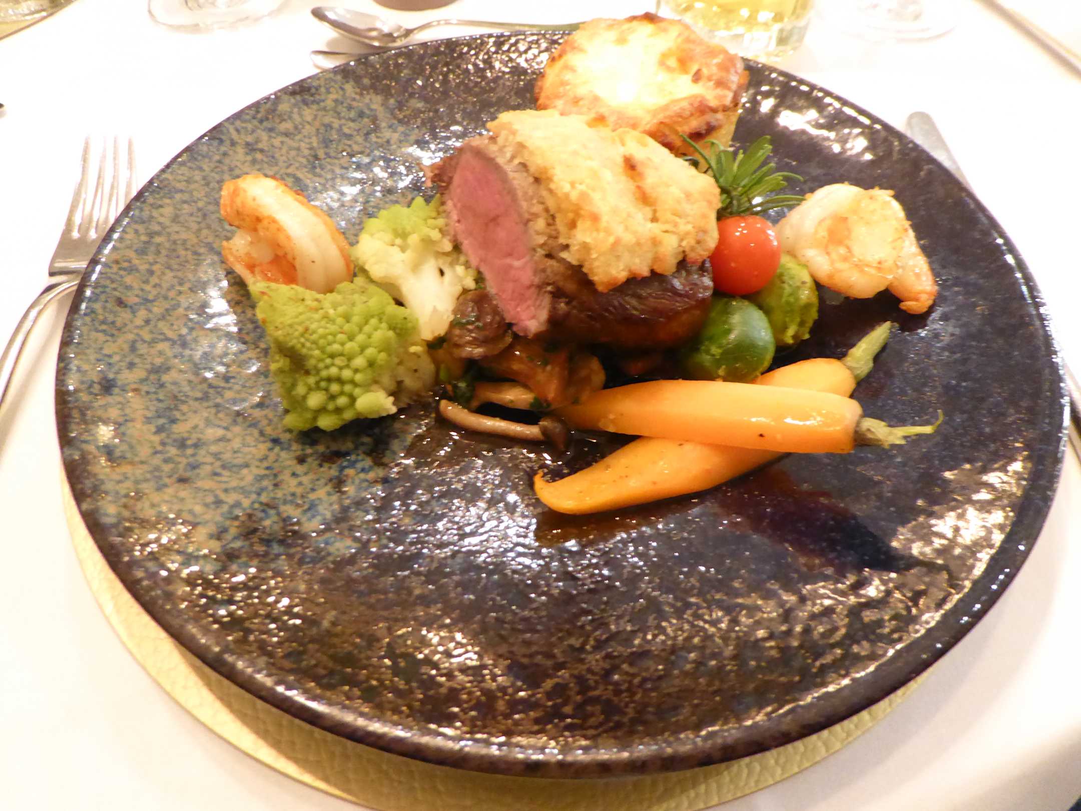 Land & Meer: Kalbsfilet in Kräuter-Käse-Kruste mit Garnelen, Gemüse der Saison & Kartoffelgratin.