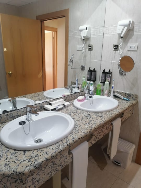 2 Waschbecken mit Fön und Kosmetikspiegel sowie Pflegeutensilien