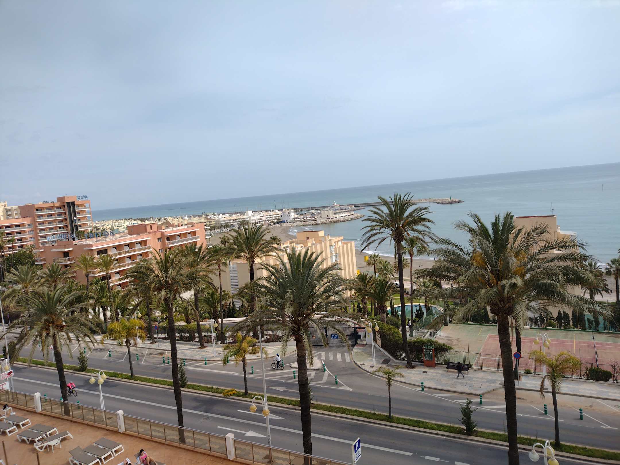 AusblickBlick vom Balkon auf das Meer und li hinten Teil des Hafens. Vom Hotel kam man durch eine Unterführung zum Strand .
