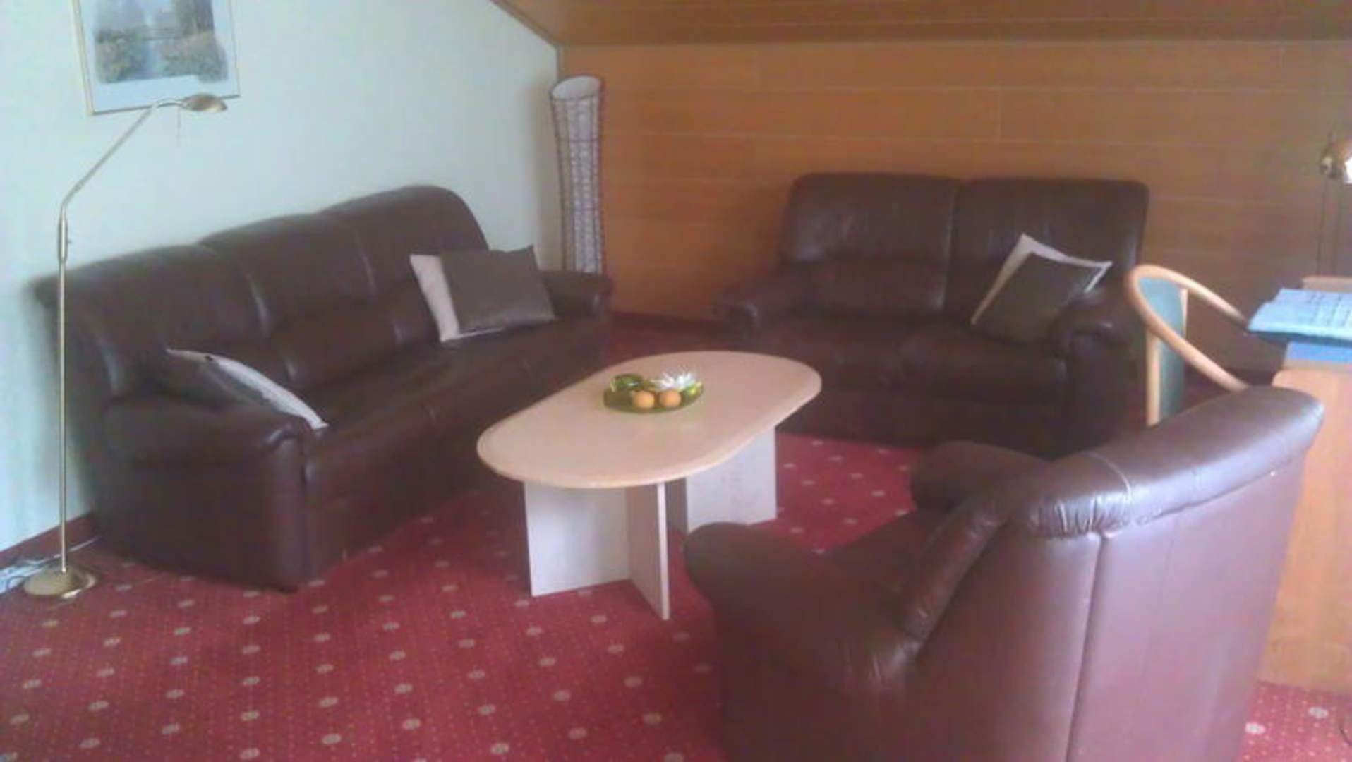 Wohnbereich im ZimmerSitzgelegenheiten sind massenhaft vorhanden. Der (kleine) Flachbildfernseher ist im Rücken des Fotografen.