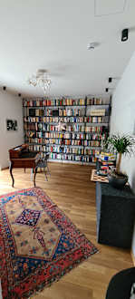Bibliothek mit Spielen und Sitzmöglichkeiten