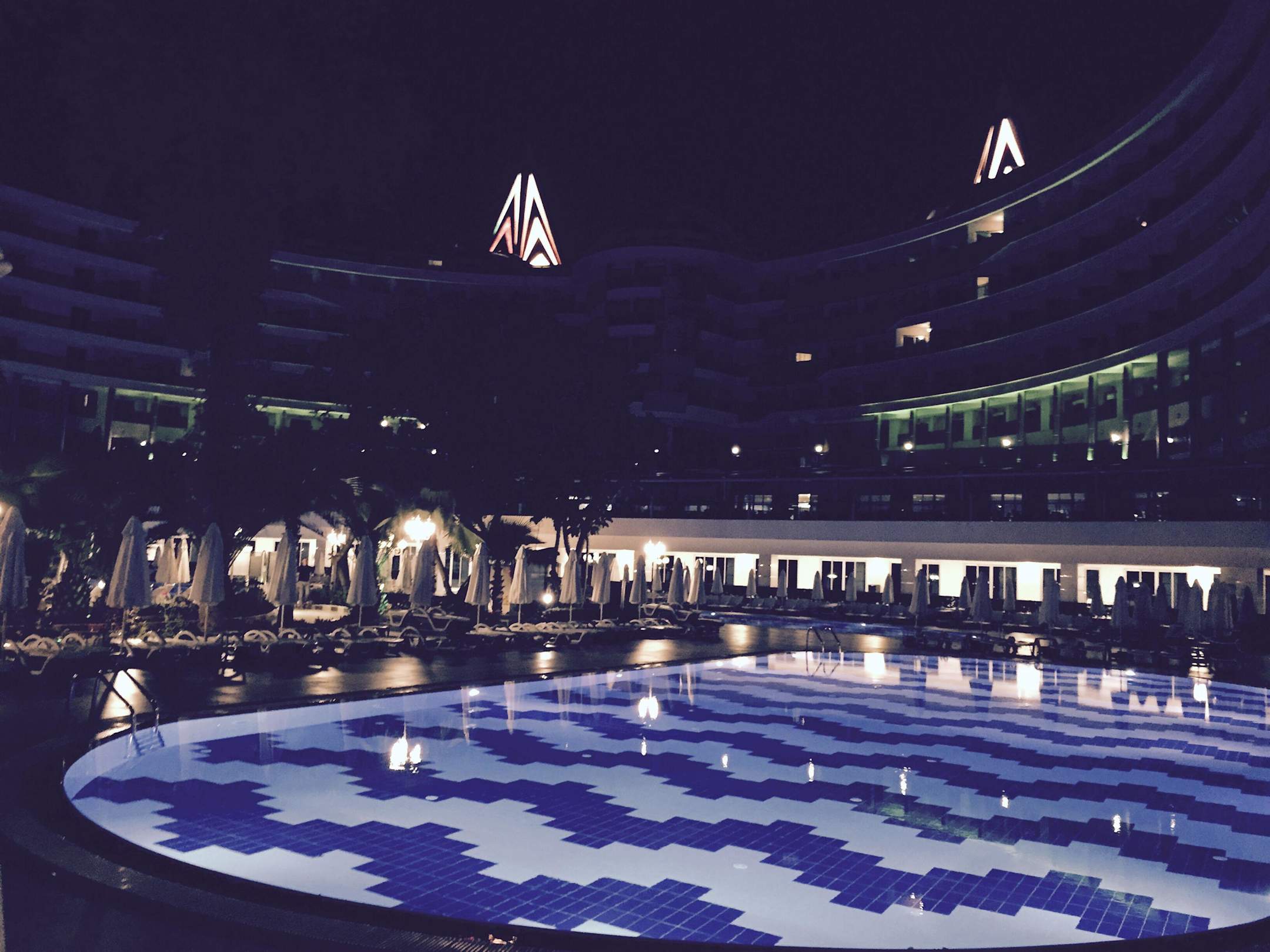 Hotel und Pool bei Nacht