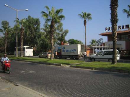 StraßeStandpunkt vorm Hoteleingang. Blick auf die Straße und das Hotel Panorama das vor dem in Zweiter reihe liegenden Boulevard ist.