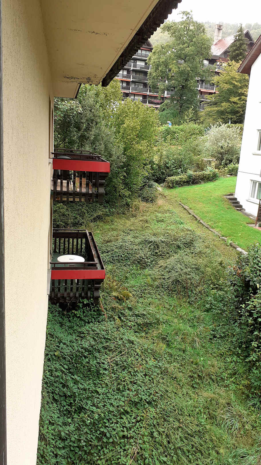 Blick vom Balkon zum anderen Balkon. Hier wächst schon das Gras auf dem Balkon