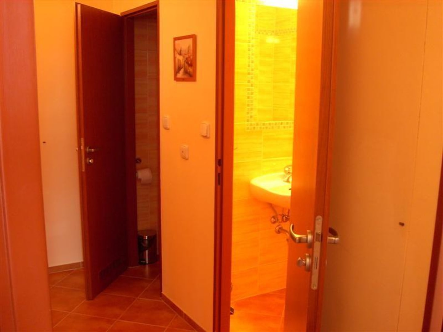 Bild vom gemeinsamen FlurGemeinsam mit zweitem Doppelzimmer genutzter Flur an dem Toilette und Bad abgehen. Toilettenraum ohne Waschbecken!