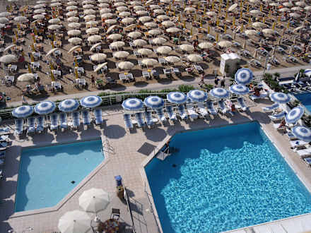 Der Ausblick aus der Junior Suite im 5. Stock. Blick auf die Poolanlage.