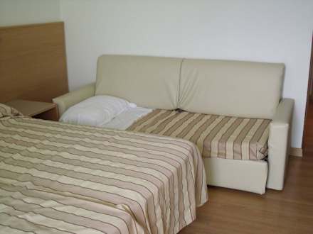 Schönes Doppelbett und Ledersofa, dass zu einem 3. Bett umgebaut wurde.