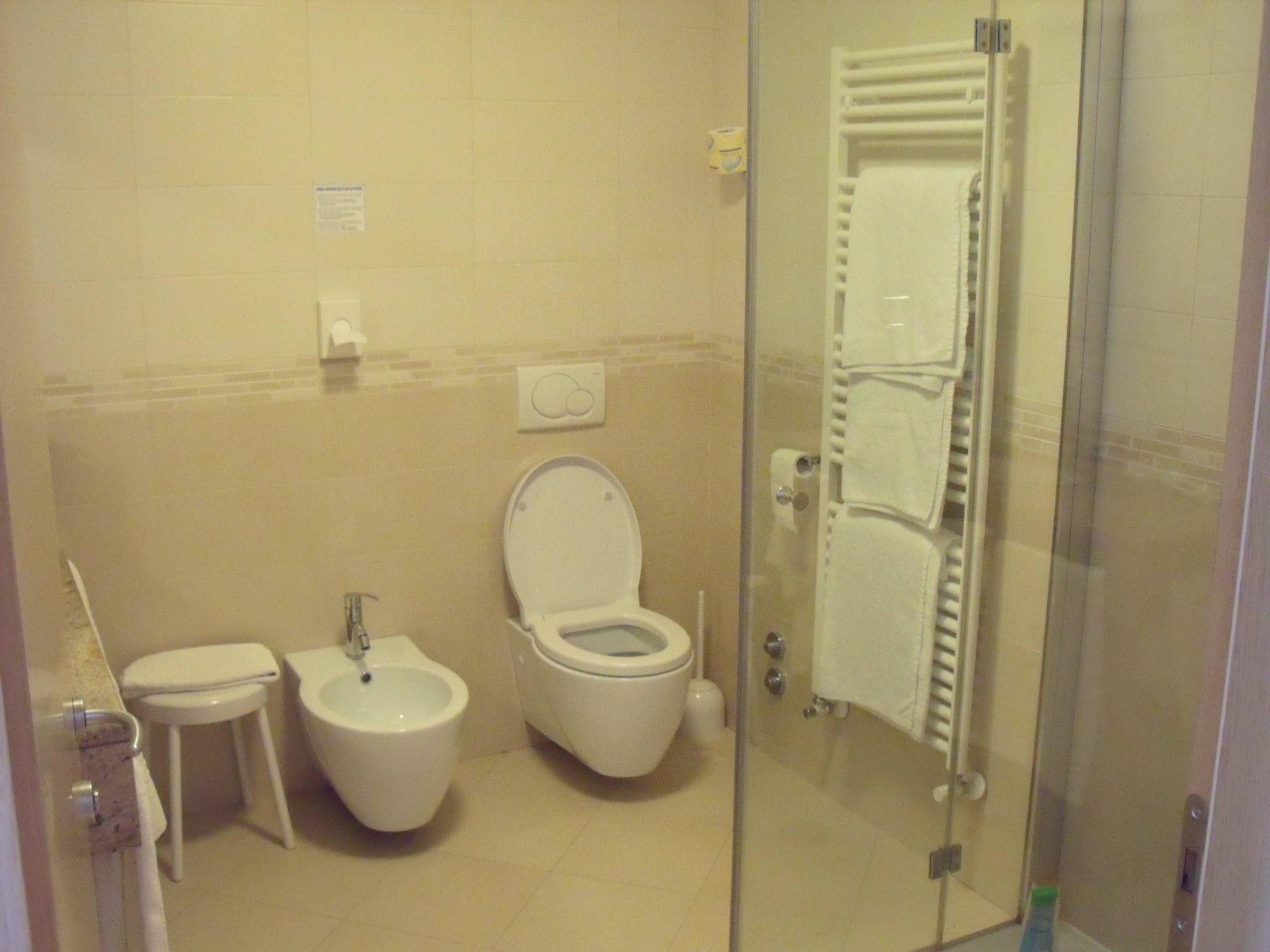 Großes Bad in der Junior Suite; WC, Bidet und Handtuchwärmer.