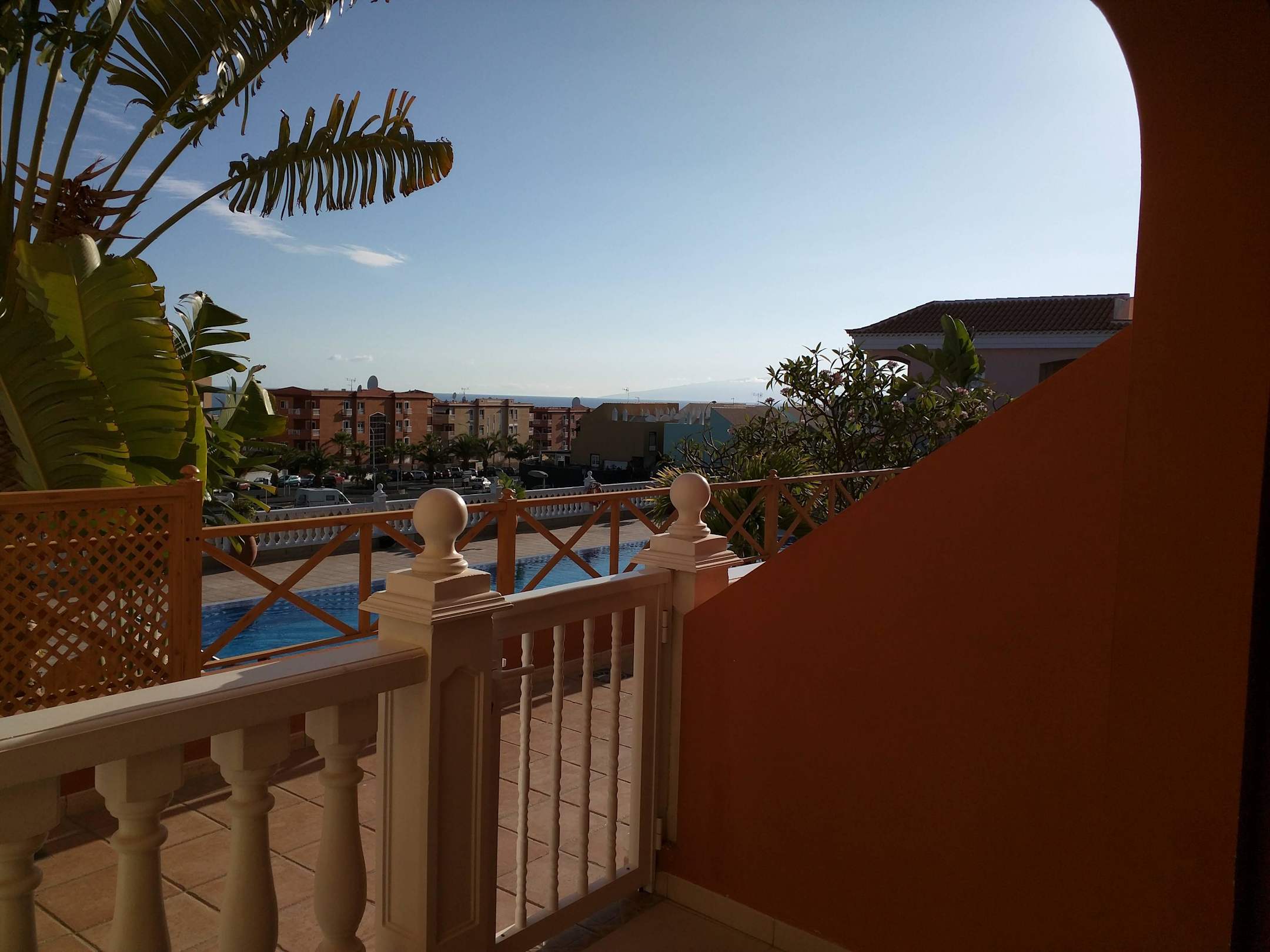 Blick von der Terrasse auf den Pool und aufs Meer