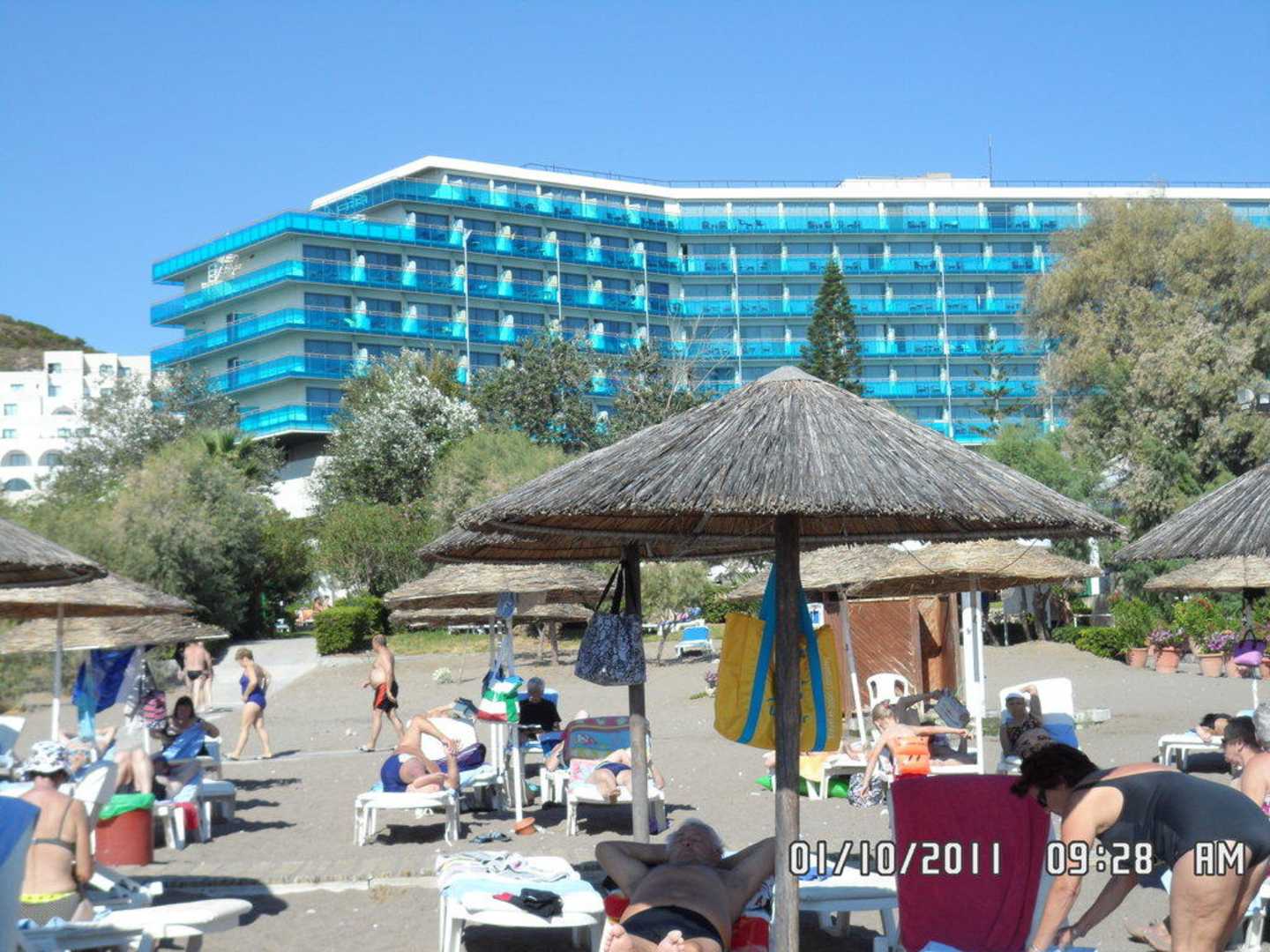 Blick vom Strand auf Hotel Calypso Beach.