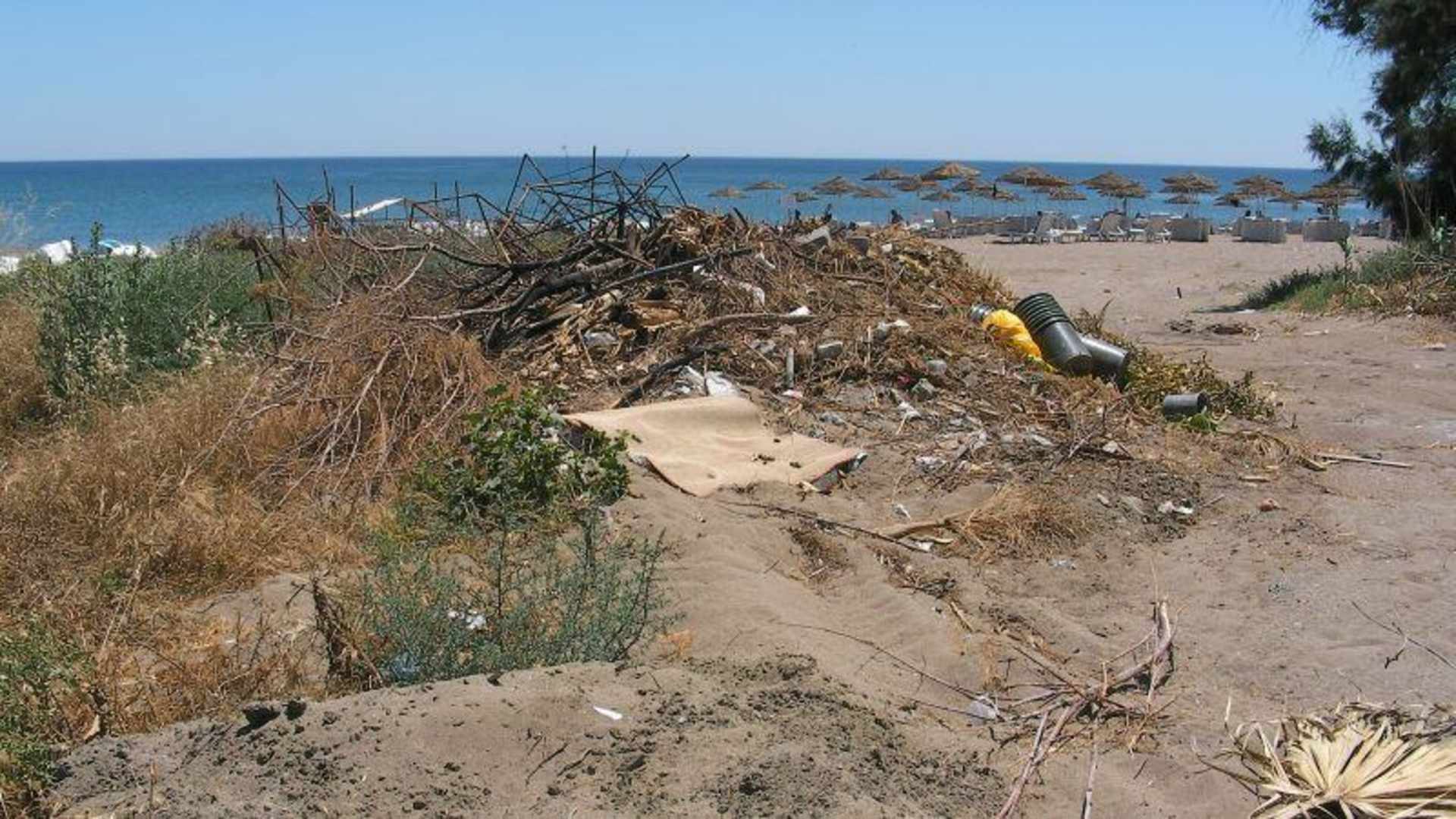 Müll am Strand und neben der Rasenliegefläche
