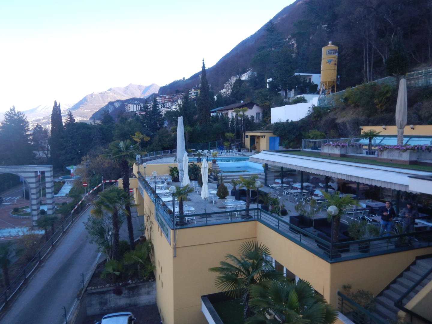 Widok z apartamentu na restaurację i basen hotelu