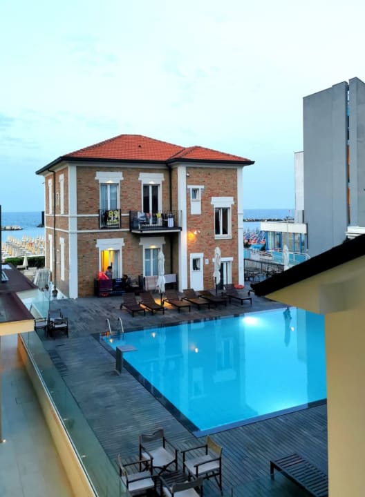 Blick vom Zimmer auf das Nebengebäude und Pool