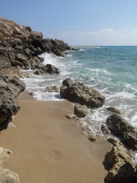 kleines Stück Sandstrand am Hotel, man steigt Klippen hinab