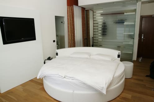 Bett und Schranknische hinter Glaswand