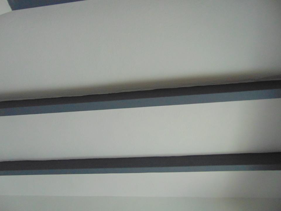 Zimmerdecke mit dekorativen grauen Holzbalken