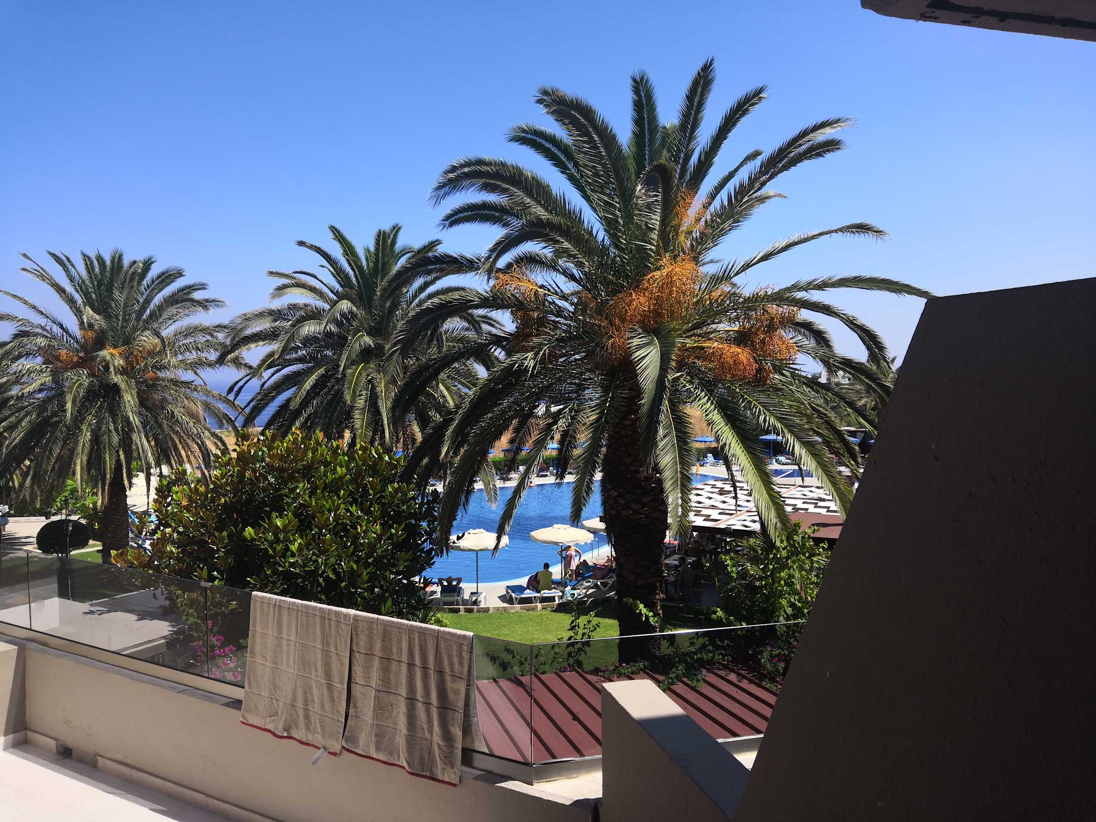 Blick vom Zimmer auf Pool und Meer