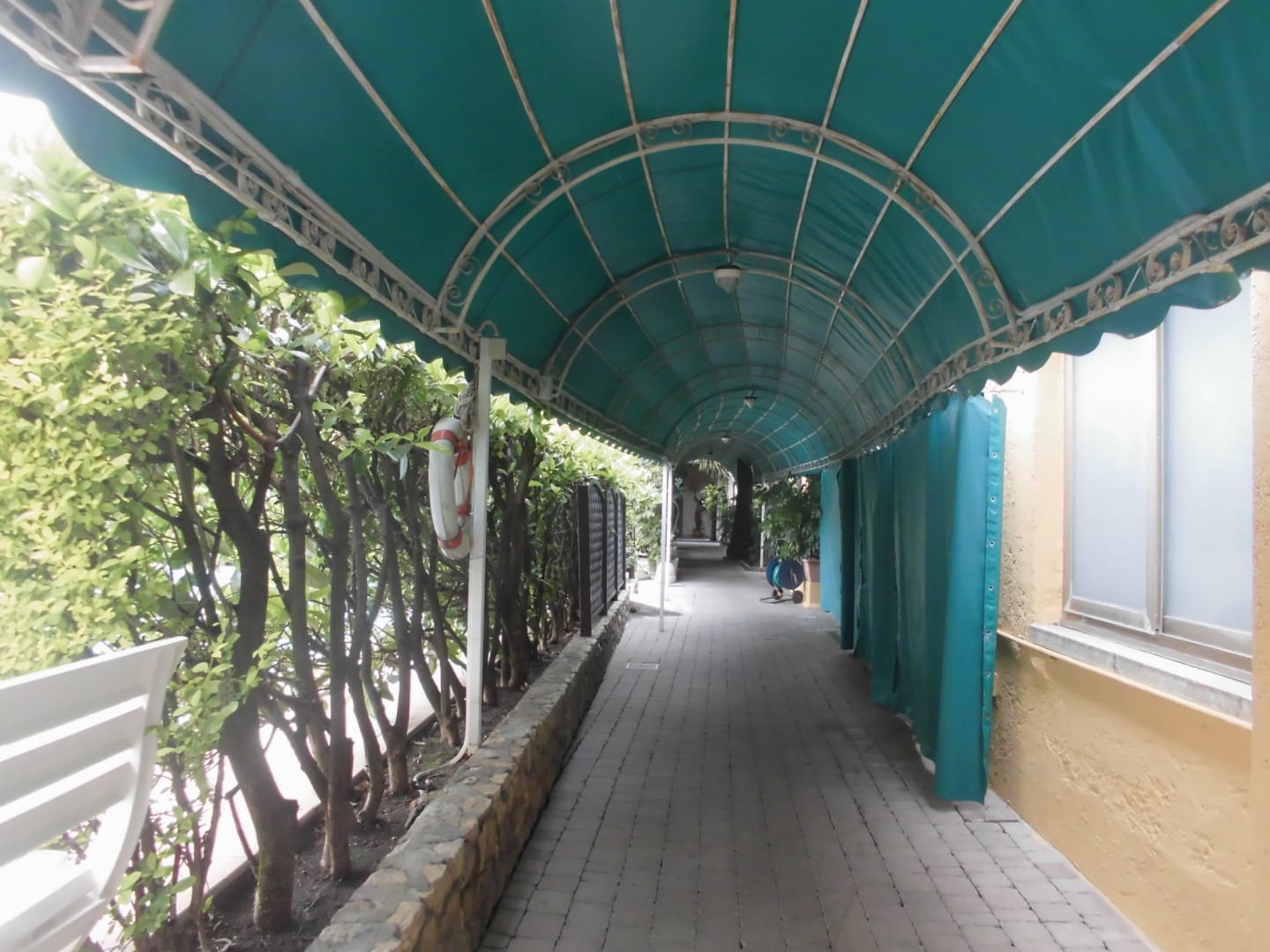 Gang vom alten zum neuen Teil; links, hinter den Sträucher befindet sich der Pool