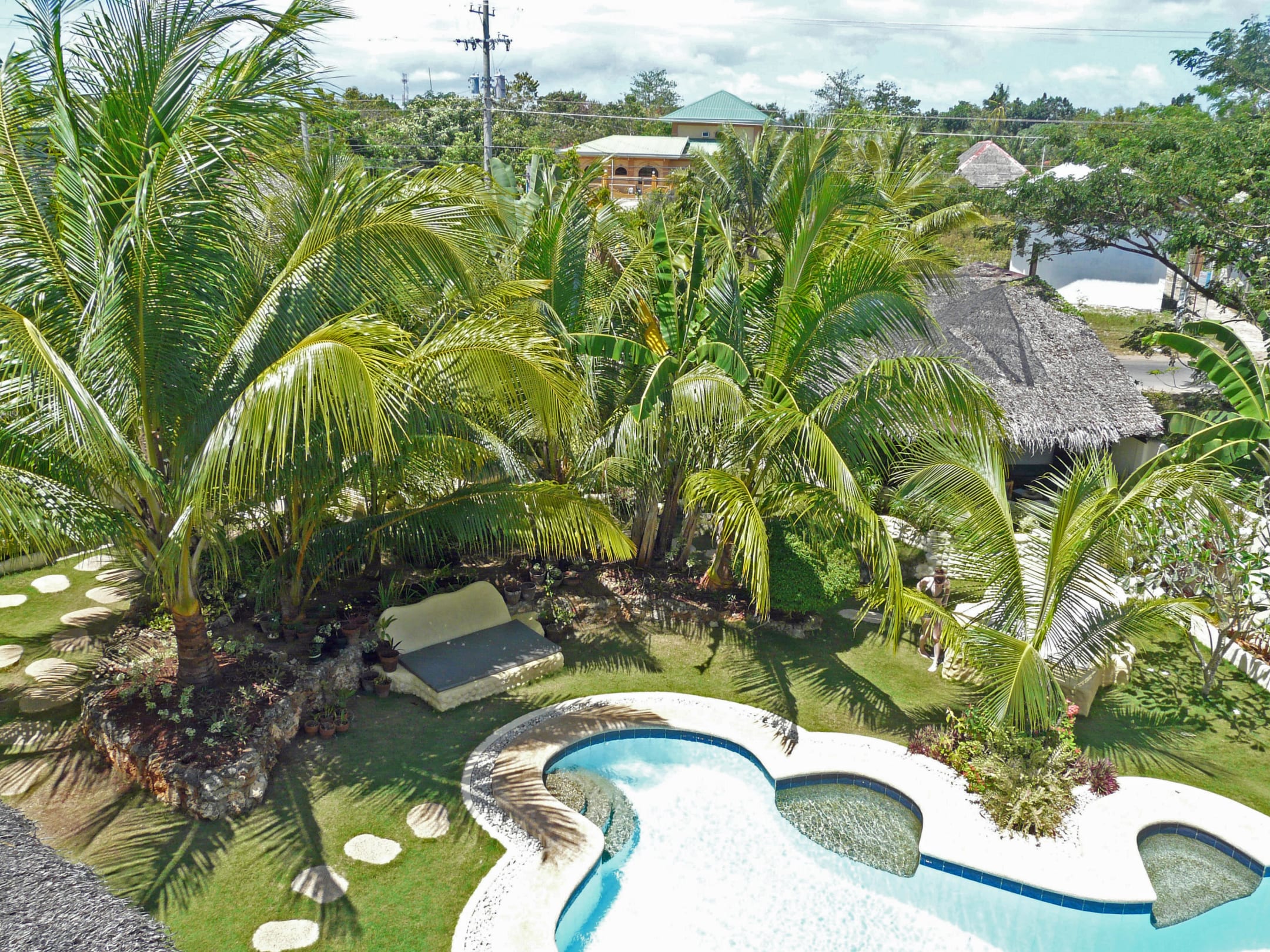 Blick in den Garten und auf den Pool von der Suite aus.