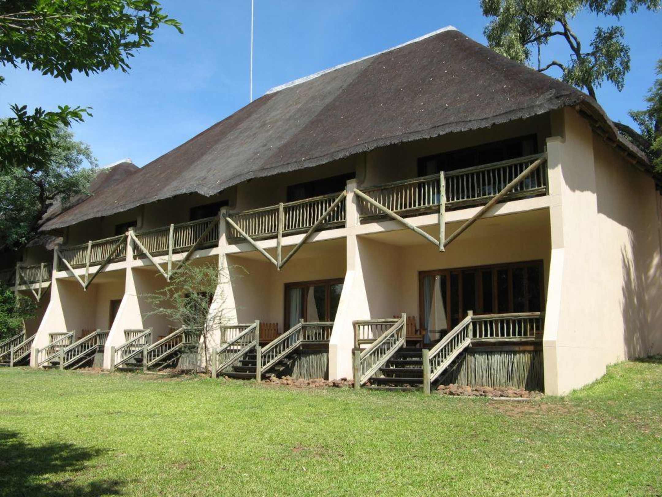Alle Zimmer haben von ihren Terrassen bzw. Balkonen einen freien Blick in den Garten und auf den Chobe River. Die hauseigenen Affen statten Besuche ab, wenn die Gitter vor den Aussentüren nicht verschlossen sind.