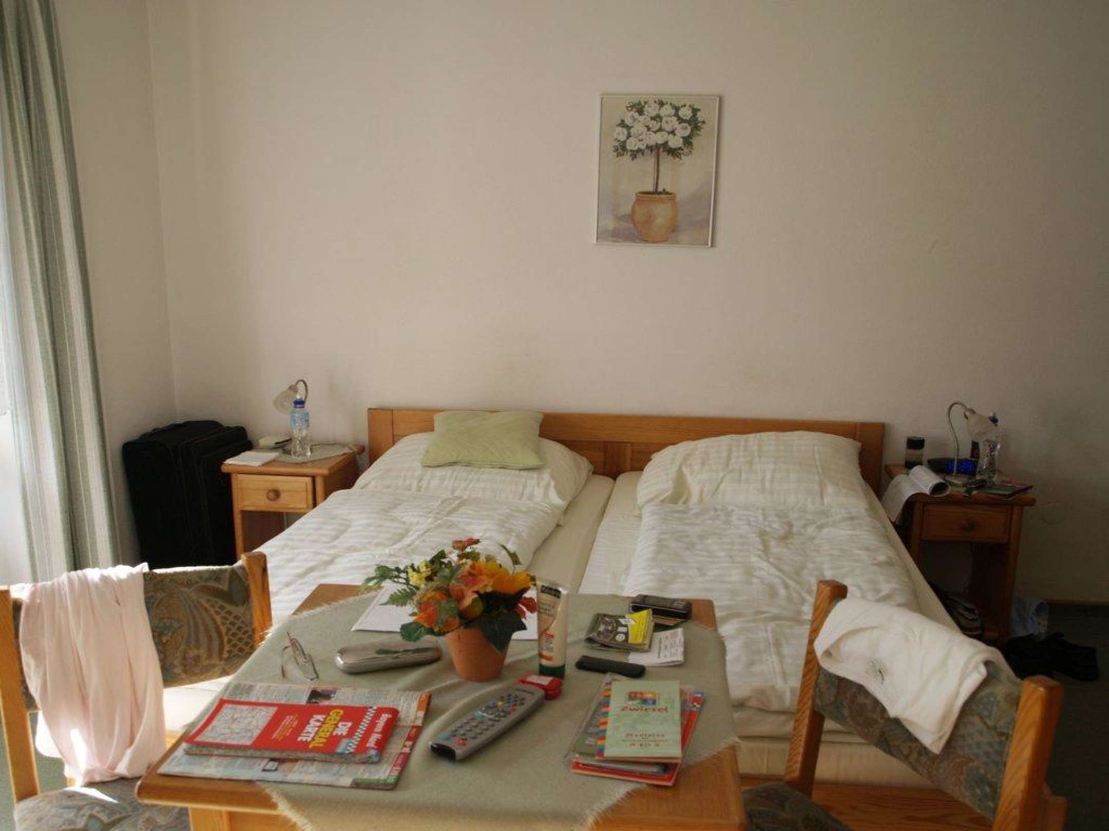 Ansicht BettenVor den Betten der Tisch mit einem Blumentopf incl. Plastikblumen. Links große Fensterfront mit Außenrollos, großer Balkon.