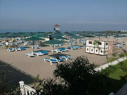 Blick von poolterrasse auf strand