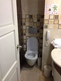 sehr schmalles WC - man ist förmlich zwischen der Mauer und der Glaswand der Dusche eingeklemmt mit den Schultern. Hauptsache man hat ein Telefon damit man Hilfe holen kann wenn man stecken bleibt.