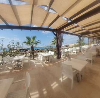 Blick vom Speisesaal zum Meer