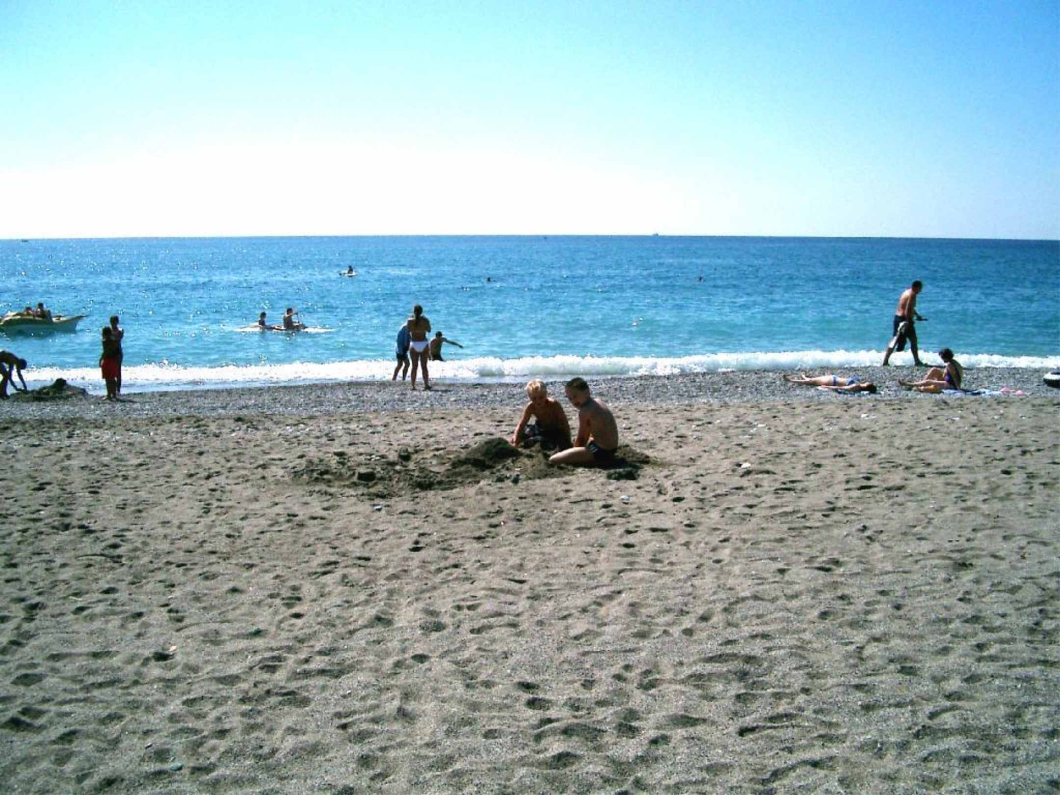 Hausstrand vom Club-Paradiso, grauer Sand mit Kiesel im Flutsaum, sehr schnell tief