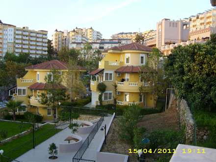 2 von 6 Villen im vorderen Bereich, im Hintergrund (rechts) die riesigen Gebäude